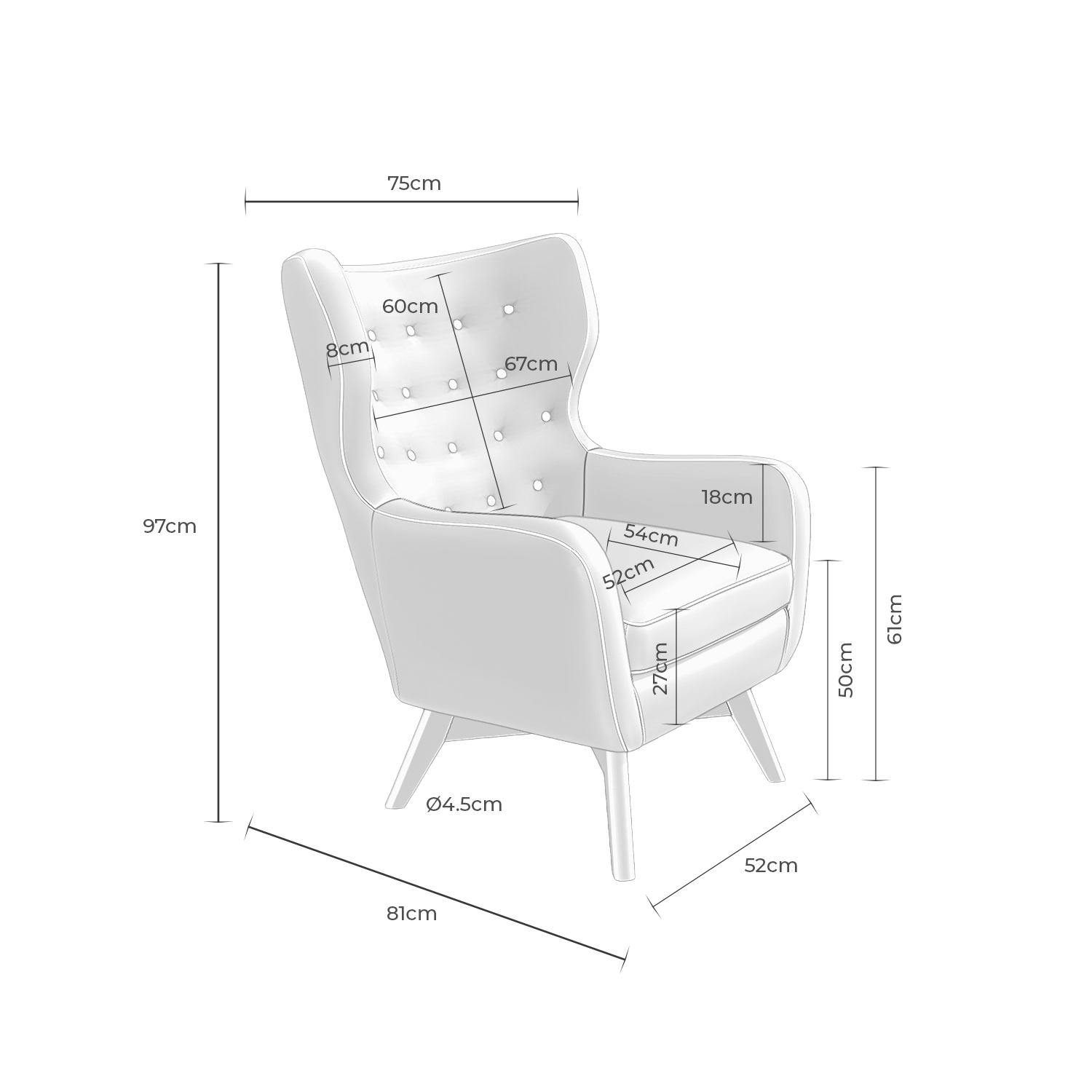 La butaca LISBOA está diseñada para aportar confort y estilo a cualquier espacio del hogar. Su estructura se apoya sobre patas de madera ligeramente inclinadas, con un acabado en color natural que resalta la calidez del diseño. El respaldo, alto y envolvente, incorpora orejeras laterales y un delicado detalle de botones capitoné, elementos que refuerzan su carácter sofisticado y atemporal. Perfecta para crear un rincón de lectura, descanso o relajación, esta butaca combina funcionalidad y estética, convirtiéndose en una pieza clave tanto en salones como en dormitorios u otras zonas de descanso.