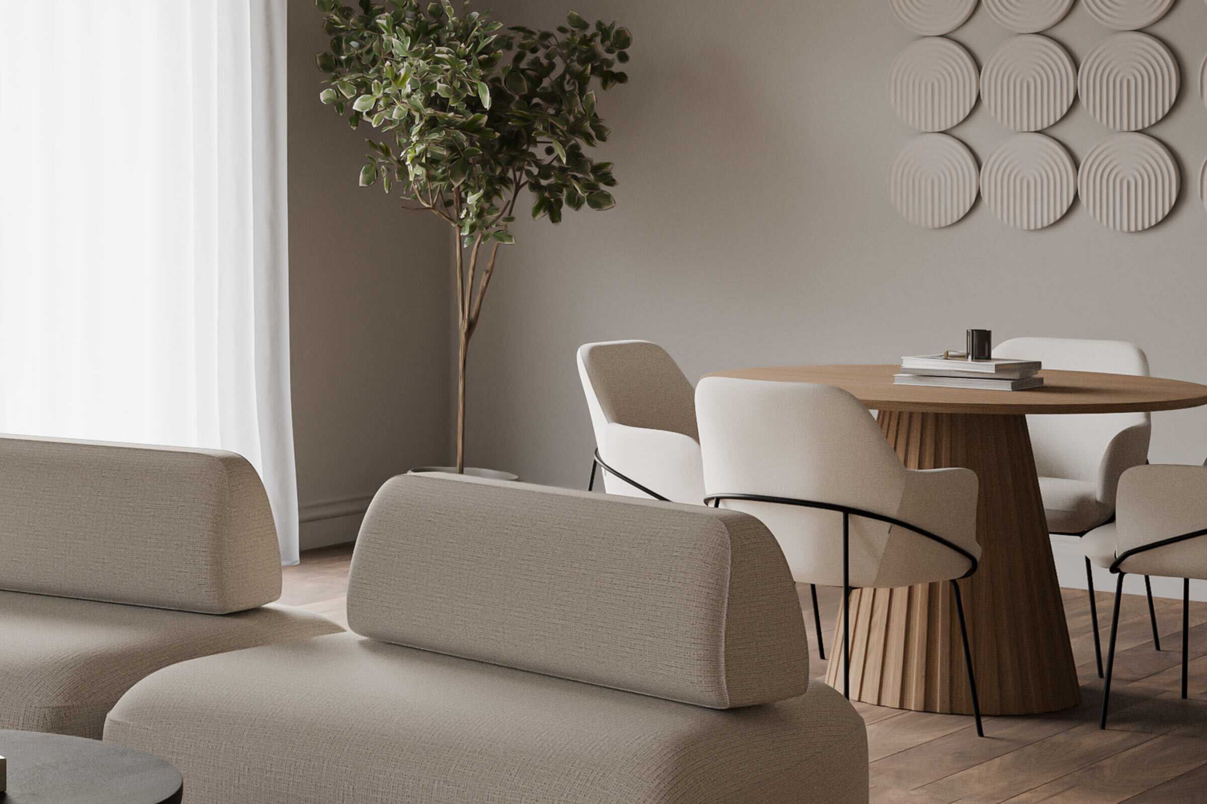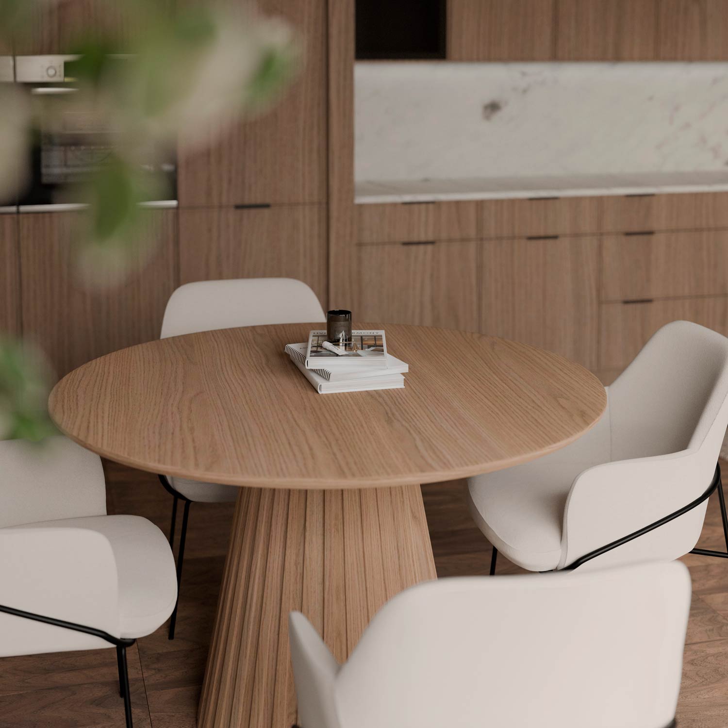 La mesa NAYLA destaca por su diseño único y lleno de personalidad, capaz de transformar cualquier espacio en el que se encuentre. El tablero, de forma circular y amplia, es de 2 cm de grosor y está elaborado en chapa de roble. La base, por su parte, es completamente distintiva, con pliegues marcados en la chapa de roble que le confieren una estética moderna y sofisticada. El acabado natural de la mesa NAYLA y sus líneas limpias la convierten en una pieza versátil, ideal tanto para ambientes modernos como rústicos.